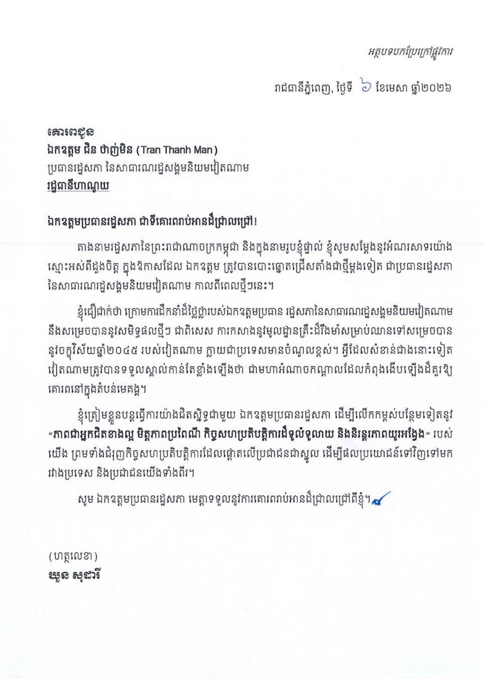 សម្តេចមហារដ្ឋសភាធិការធិបតី ឃួន សុដារី ប្រធានរដ្ឋសភា នៃព្រះរាជាណាចក្រកម្ពុជា ផ្ញេីសារលិខិតសូមសម្តែងនូវអំណរសាទរ គោរពជូន ឯកឧត្តម ជិន ថាញ់មិន (Tran Thanh Man) ប្រធានរដ្ឋសភា នៃសាធារណរដ្ឋសង្គមនិយមវៀតណាម ក្នុ