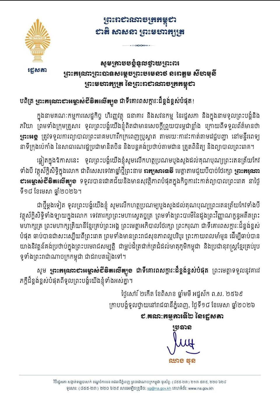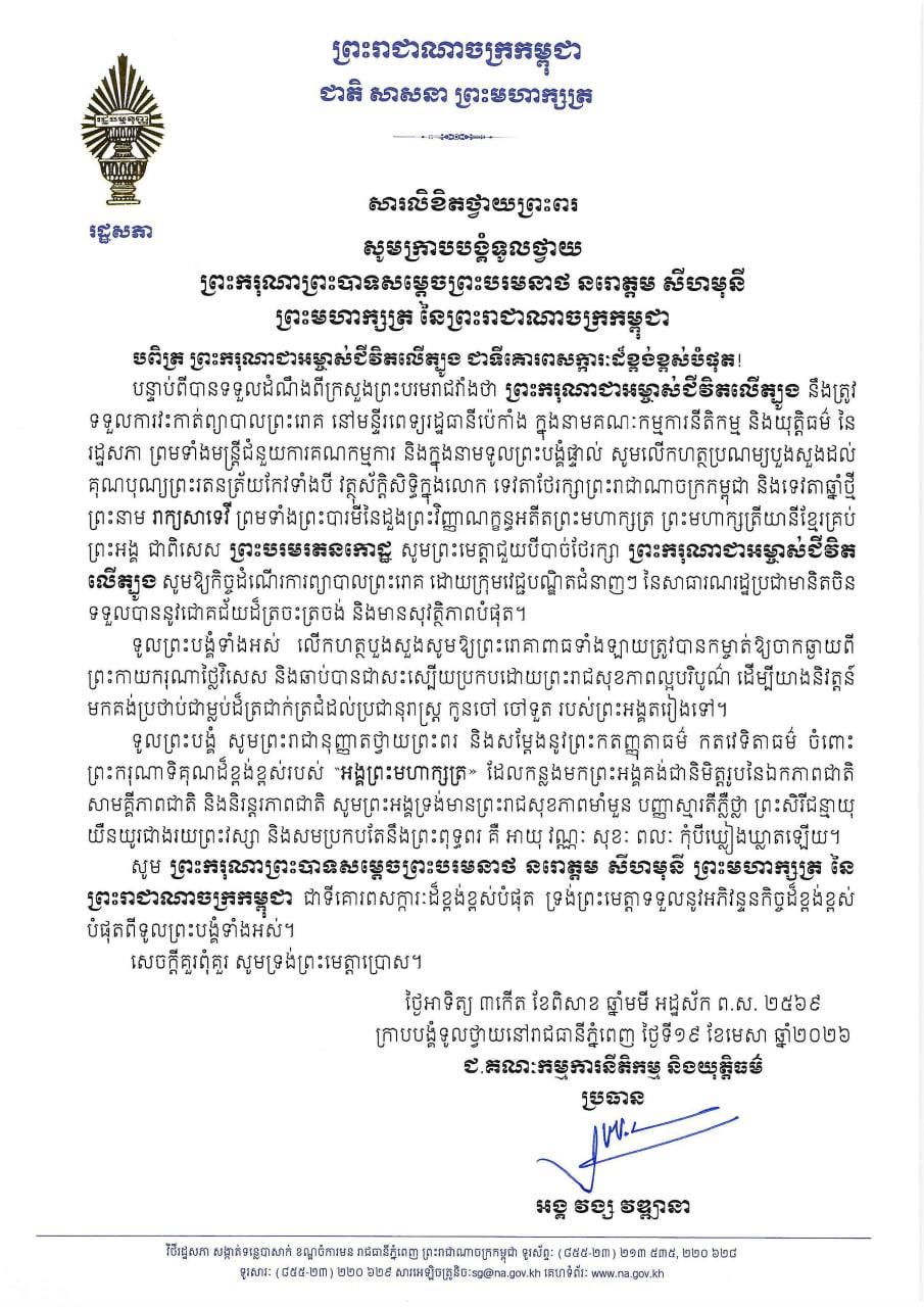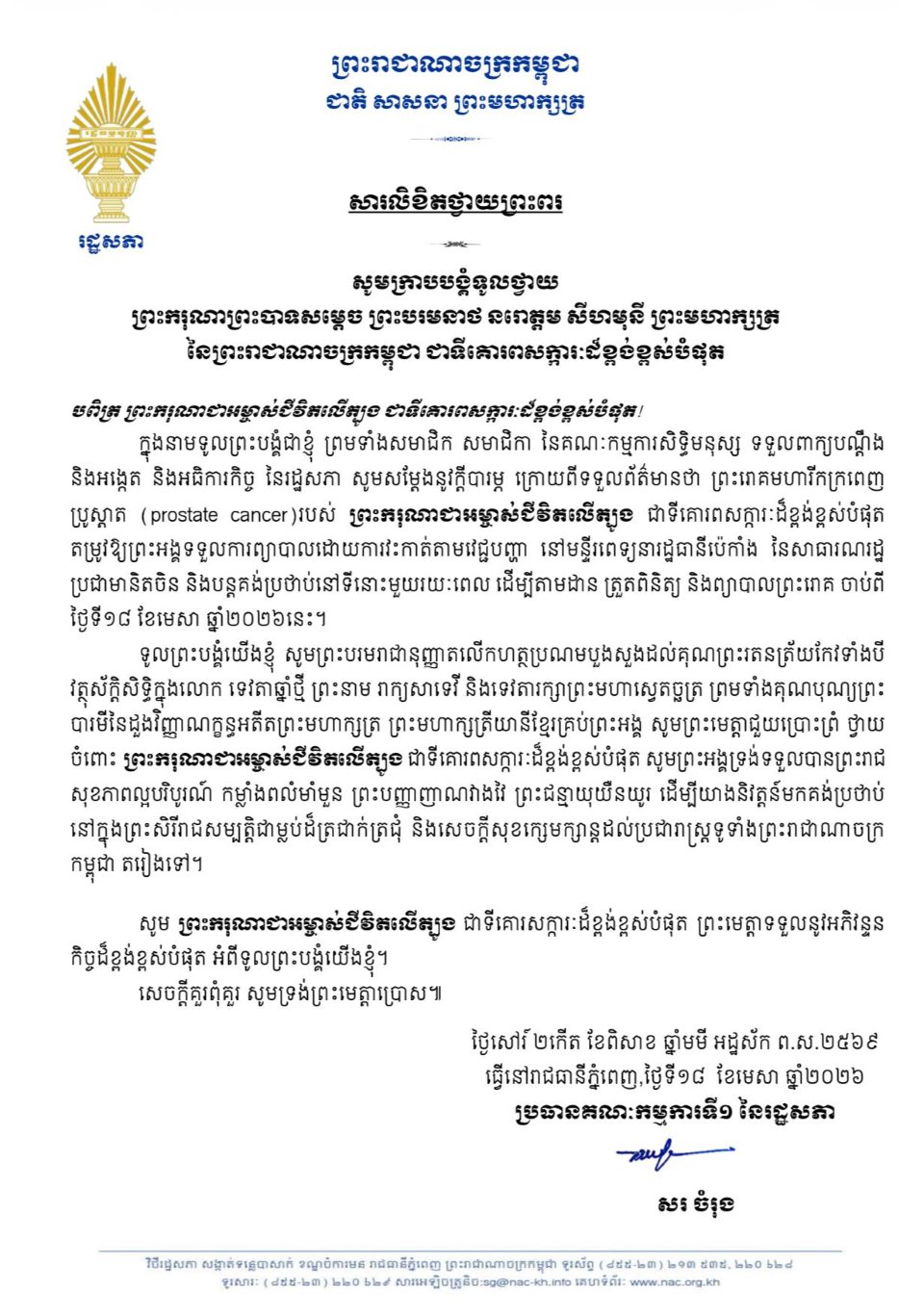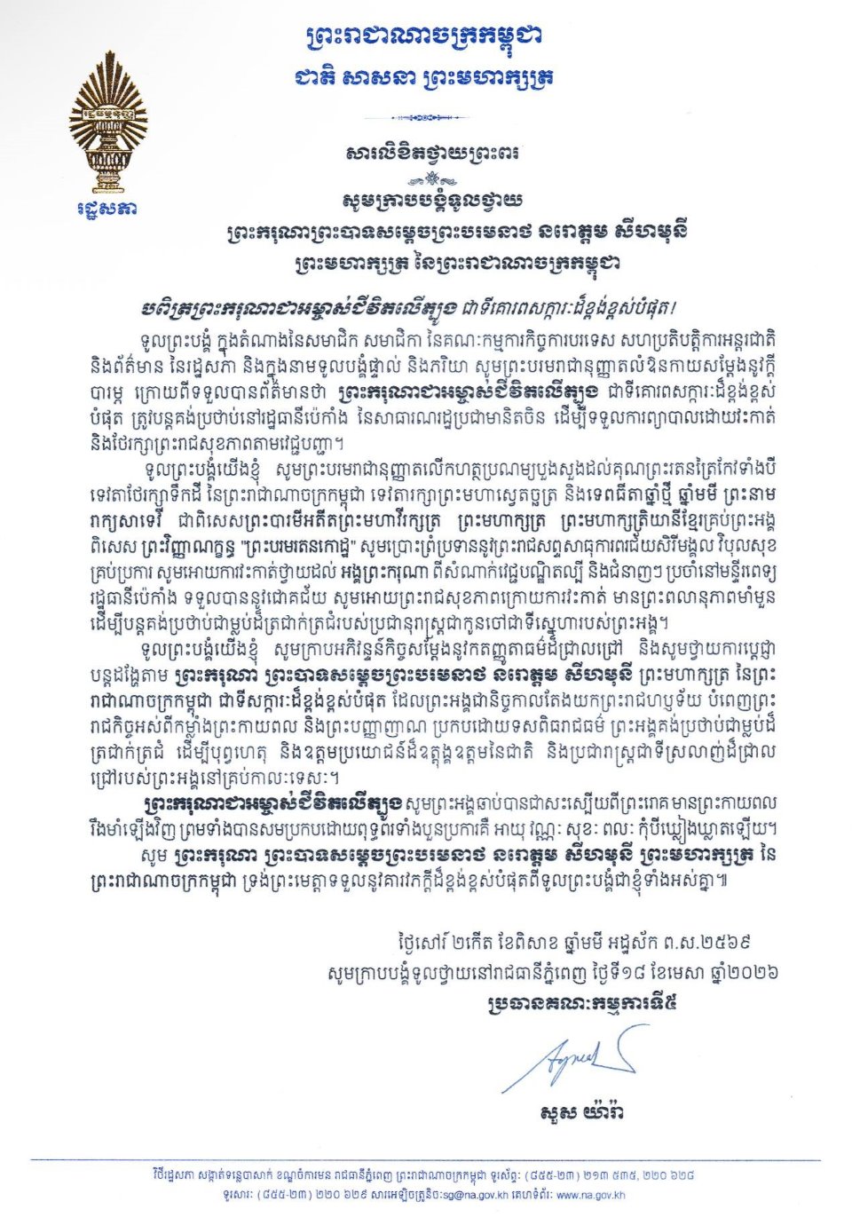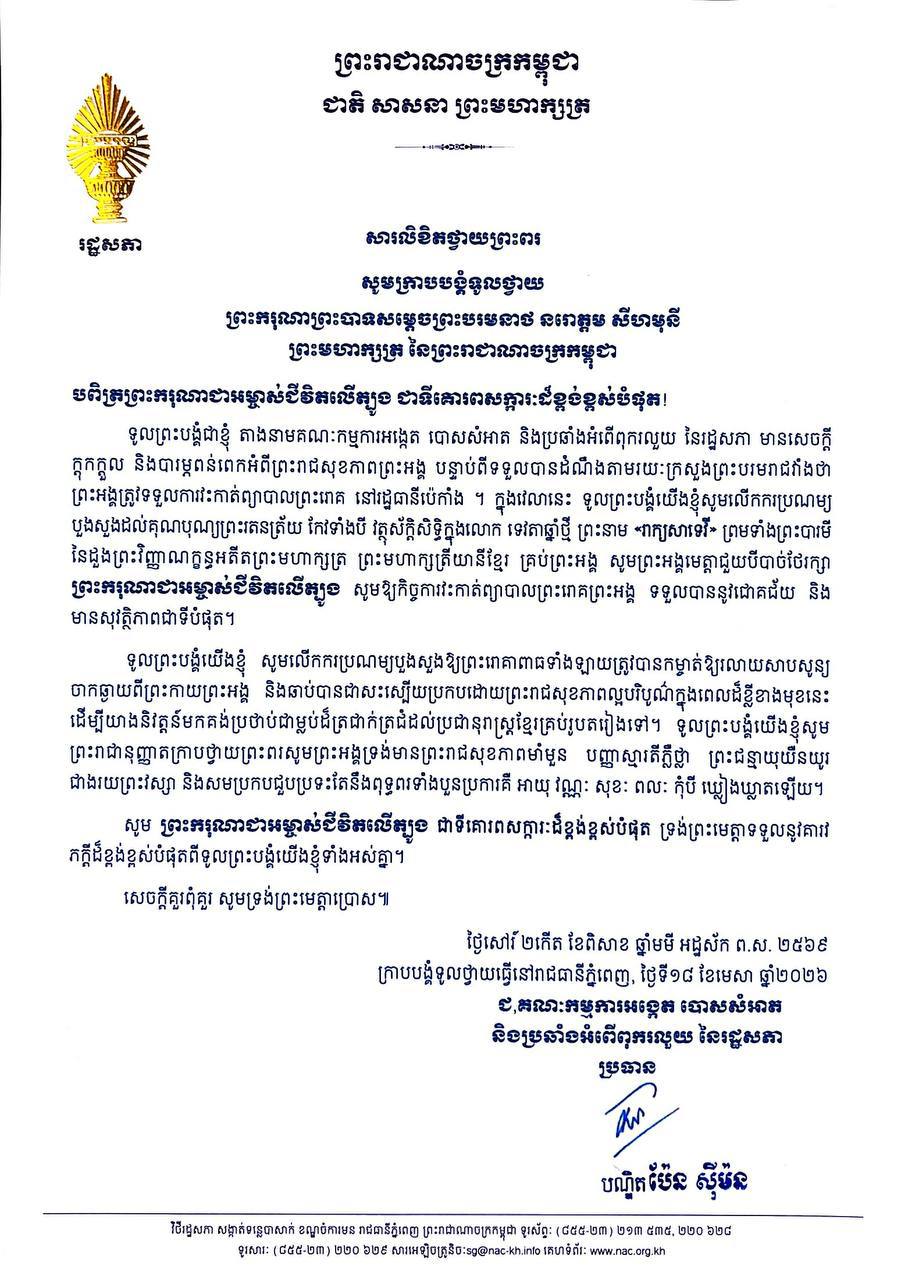 សារលិខិតថ្វាយព្រះពររបស់ សម្តេចមហារដ្ឋសភាធិការធិបតី ឃួន សុដារី ប្រធានរដ្ឋសភា ព្រមទាំង សមាជិក សមាជិការដ្ឋសភា ថ្វាយចំពោះ ព្រះករុណា ព្រះបាទ សម្តេចព្រះបរមនាថ នរោត្តម សីហមុនី ព្រះមហាក្សត្រនៃព្រះរាជាណាចក្រកម្ពុជា