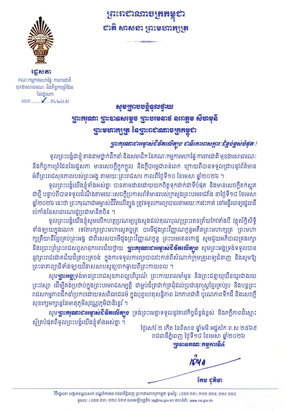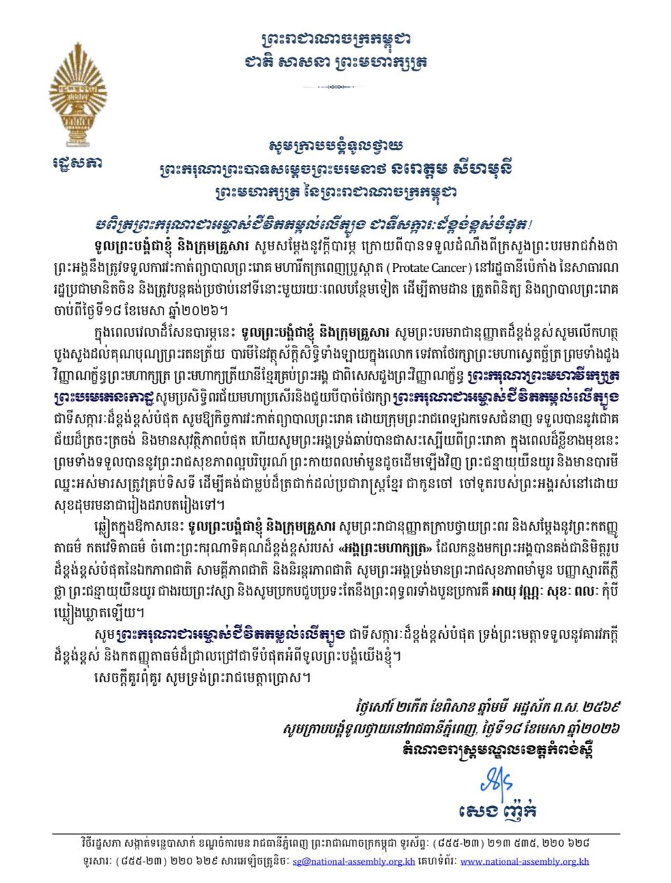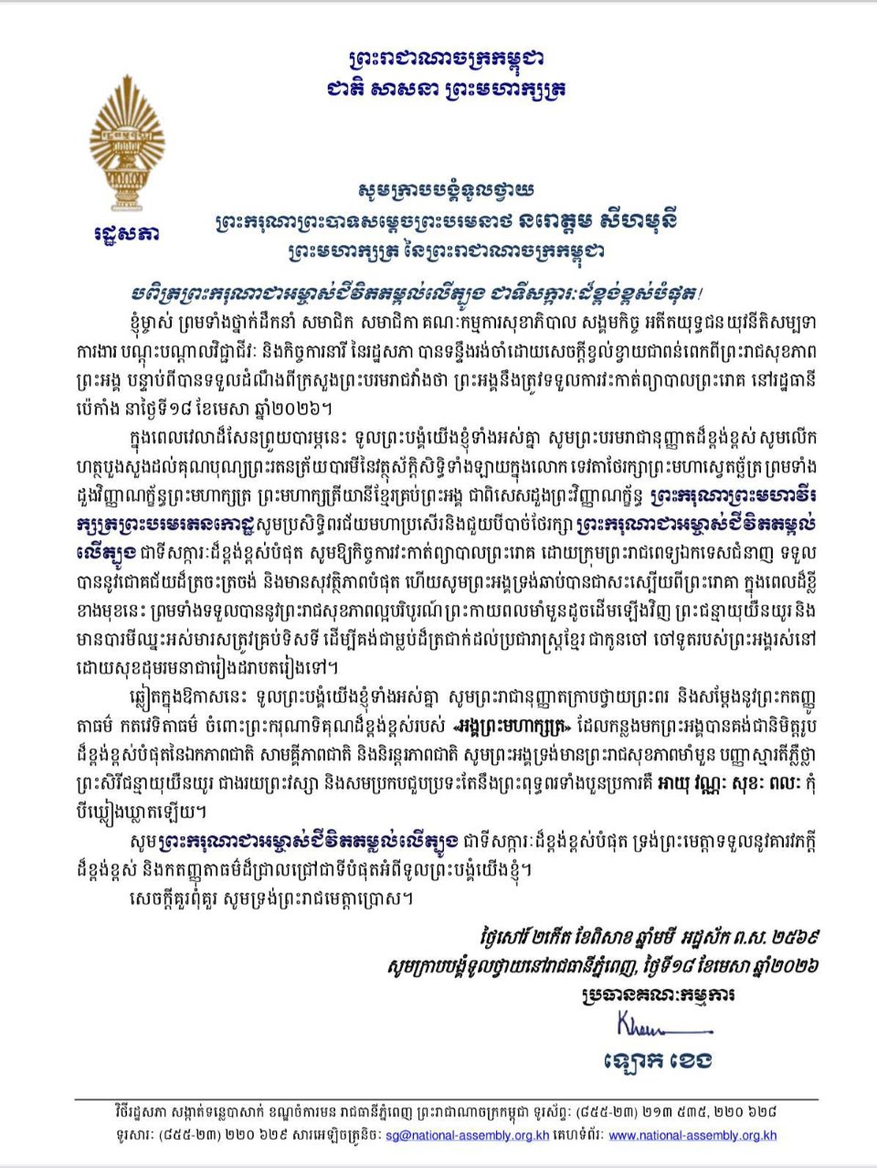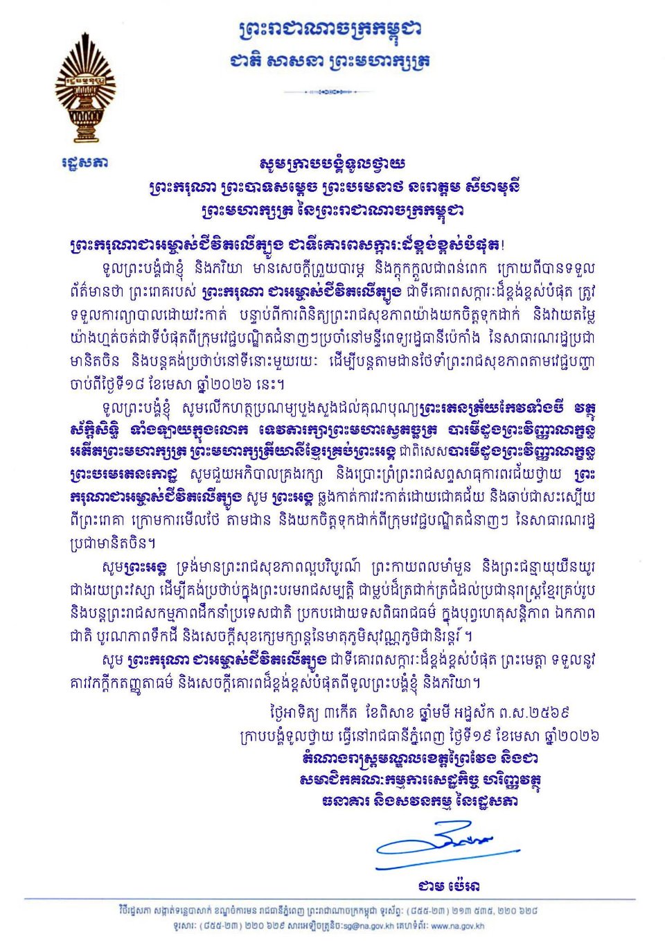 សារលិខិតថ្វាយព្រះពររបស់ សម្តេចមហារដ្ឋសភាធិការធិបតី ឃួន សុដារី ប្រធានរដ្ឋសភា ព្រមទាំង សមាជិក សមាជិការដ្ឋសភា ថ្វាយចំពោះ ព្រះករុណា ព្រះបាទ សម្តេចព្រះបរមនាថ នរោត្តម សីហមុនី ព្រះមហាក្សត្រនៃព្រះរាជាណាចក្រកម្ពុជា