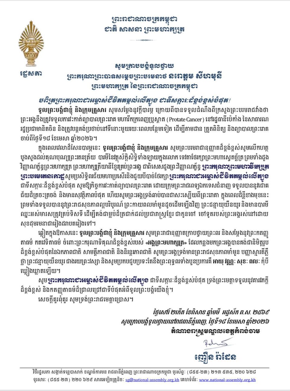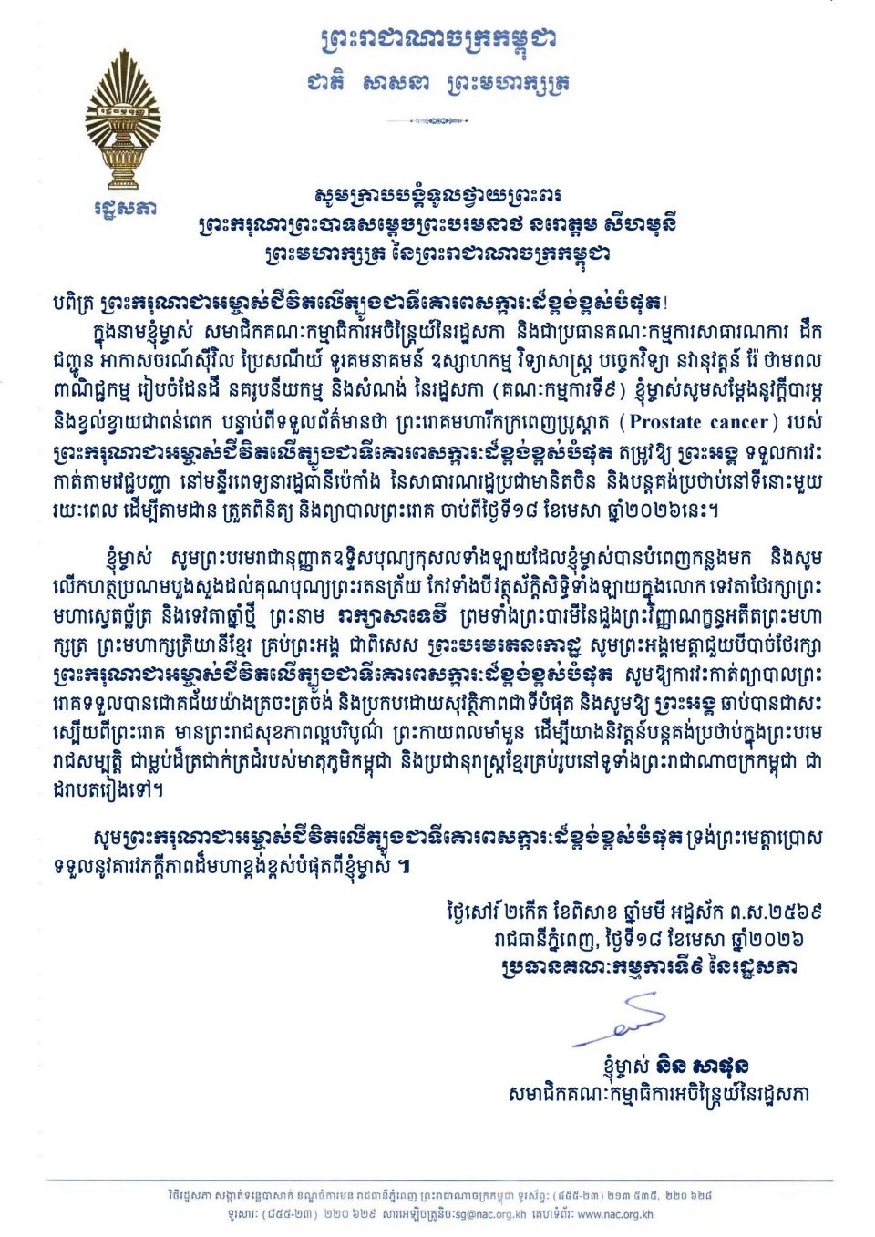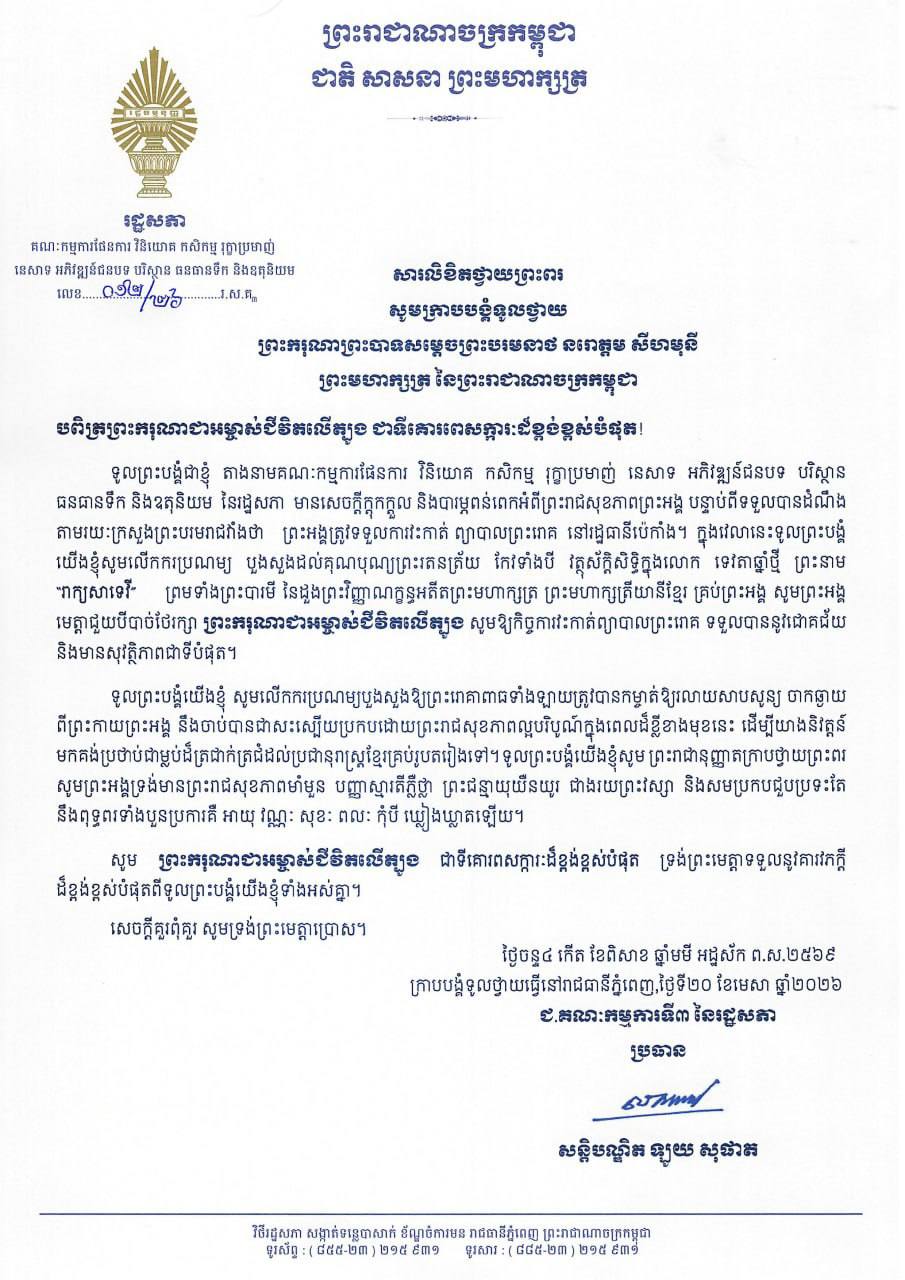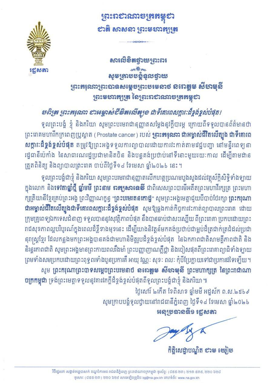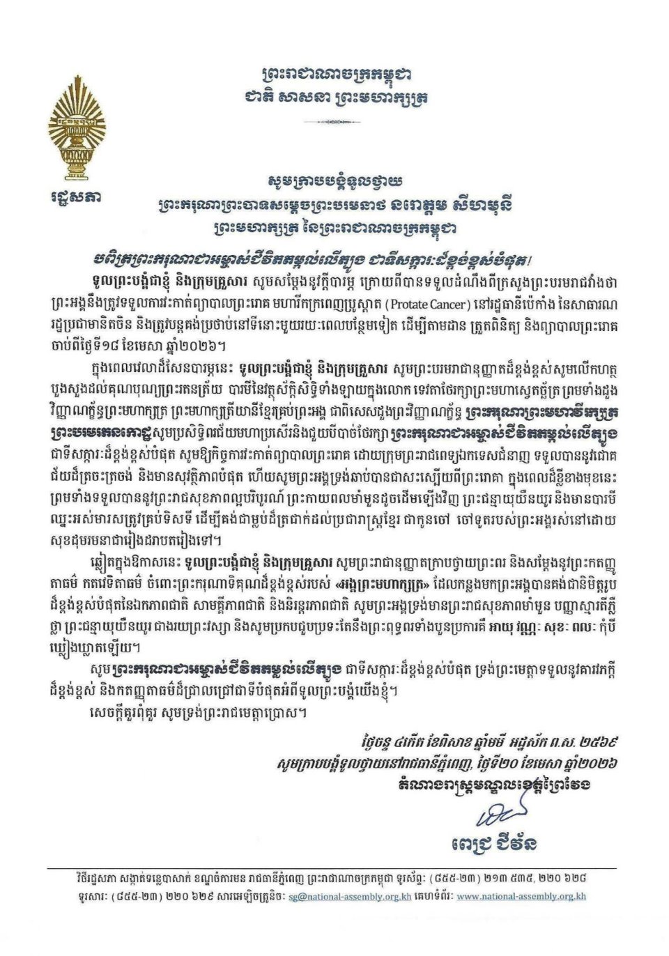 សារលិខិតថ្វាយព្រះពររបស់ សម្តេចមហារដ្ឋសភាធិការធិបតី ឃួន សុដារី ប្រធានរដ្ឋសភា ព្រមទាំង សមាជិក សមាជិការដ្ឋសភា ថ្វាយចំពោះ ព្រះករុណា ព្រះបាទ សម្តេចព្រះបរមនាថ នរោត្តម សីហមុនី ព្រះមហាក្សត្រនៃព្រះរាជាណាចក្រកម្ពុជា