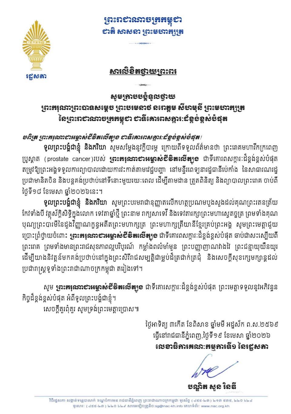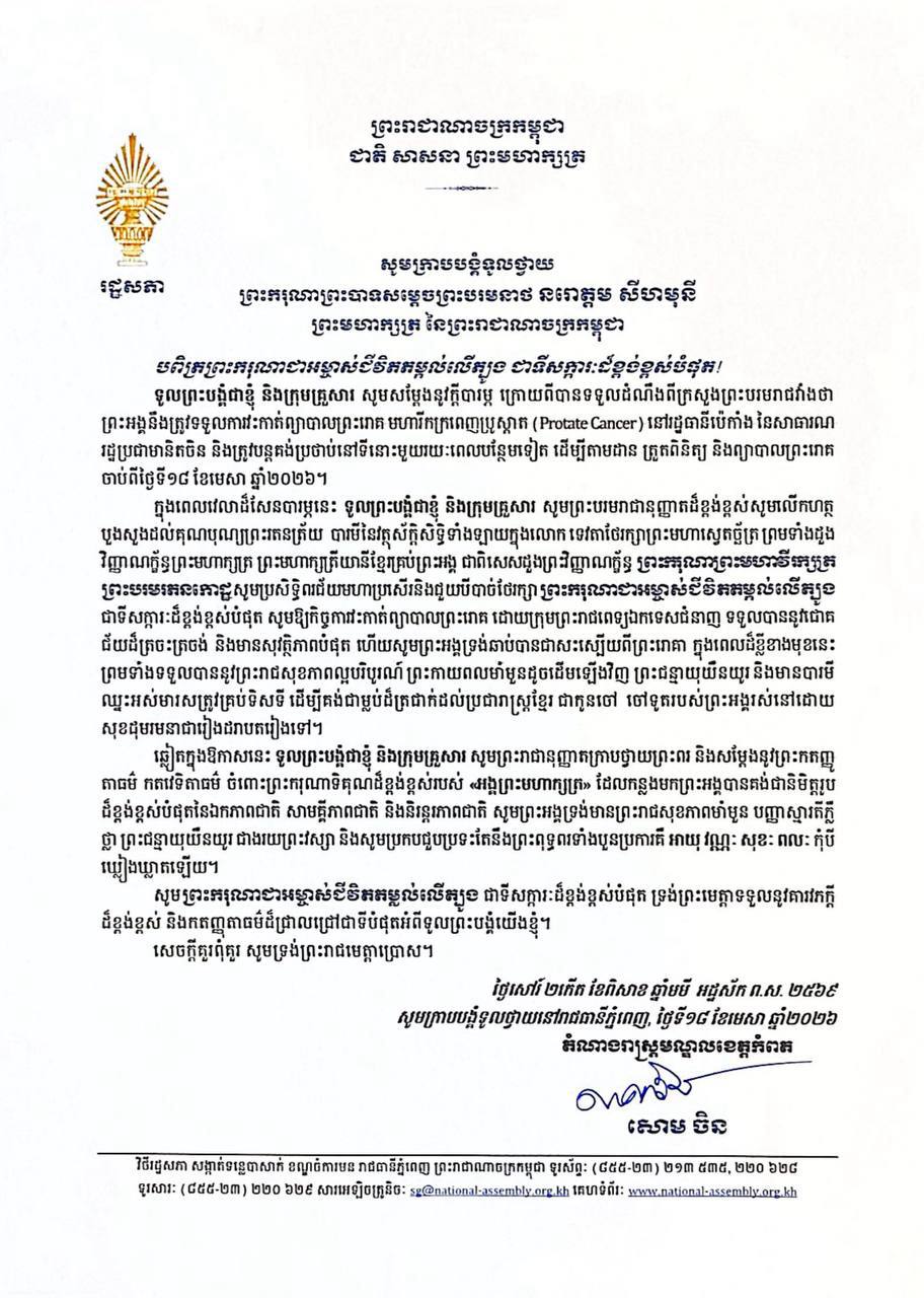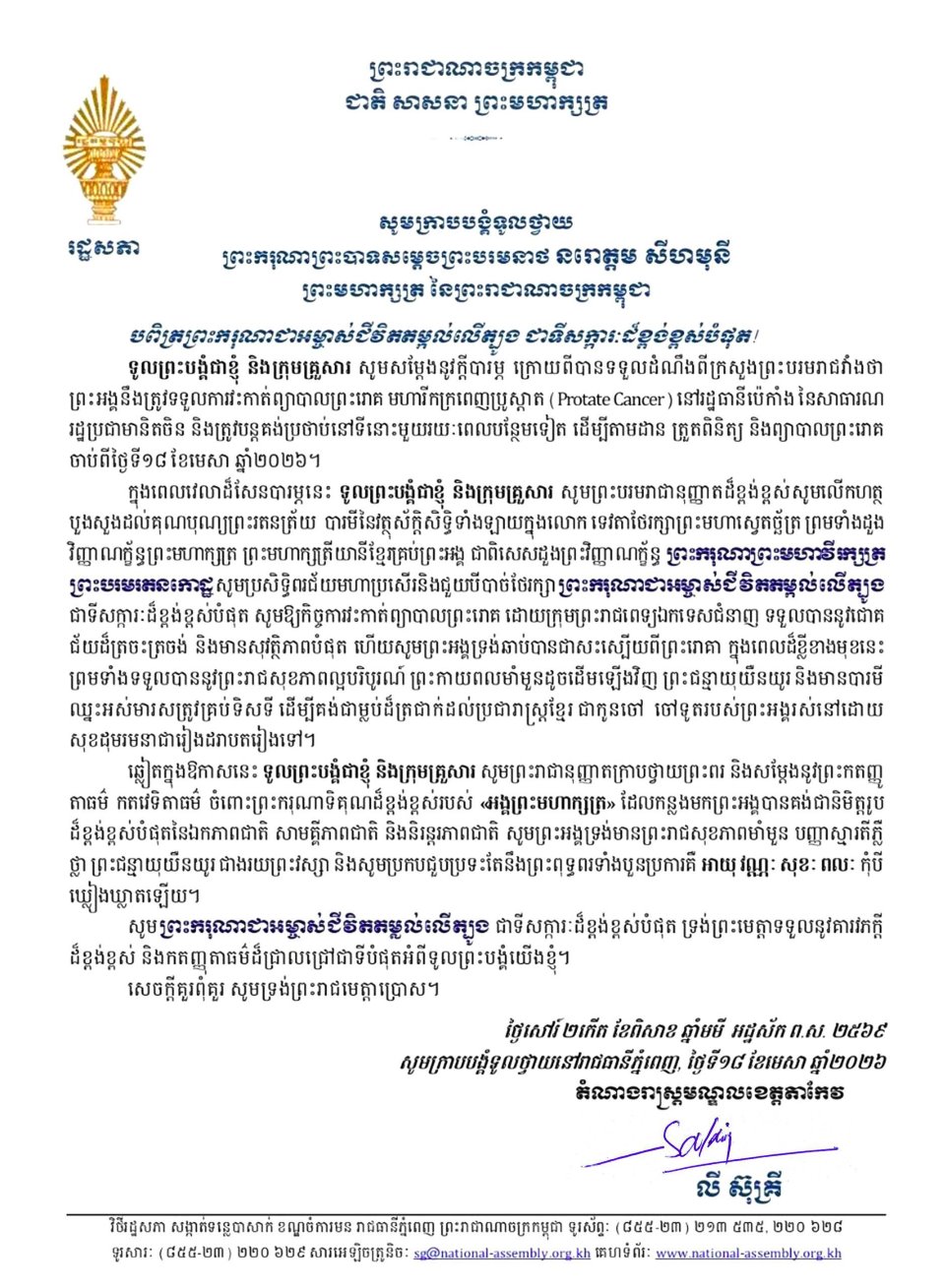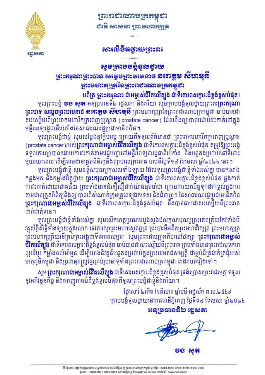 សារលិខិតថ្វាយព្រះពររបស់ សម្តេចមហារដ្ឋសភាធិការធិបតី ឃួន សុដារី ប្រធានរដ្ឋសភា ព្រមទាំង សមាជិក សមាជិការដ្ឋសភា ថ្វាយចំពោះ ព្រះករុណា ព្រះបាទ សម្តេចព្រះបរមនាថ នរោត្តម សីហមុនី ព្រះមហាក្សត្រនៃព្រះរាជាណាចក្រកម្ពុជា