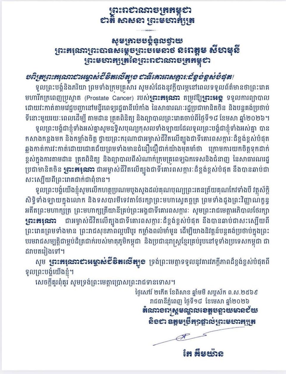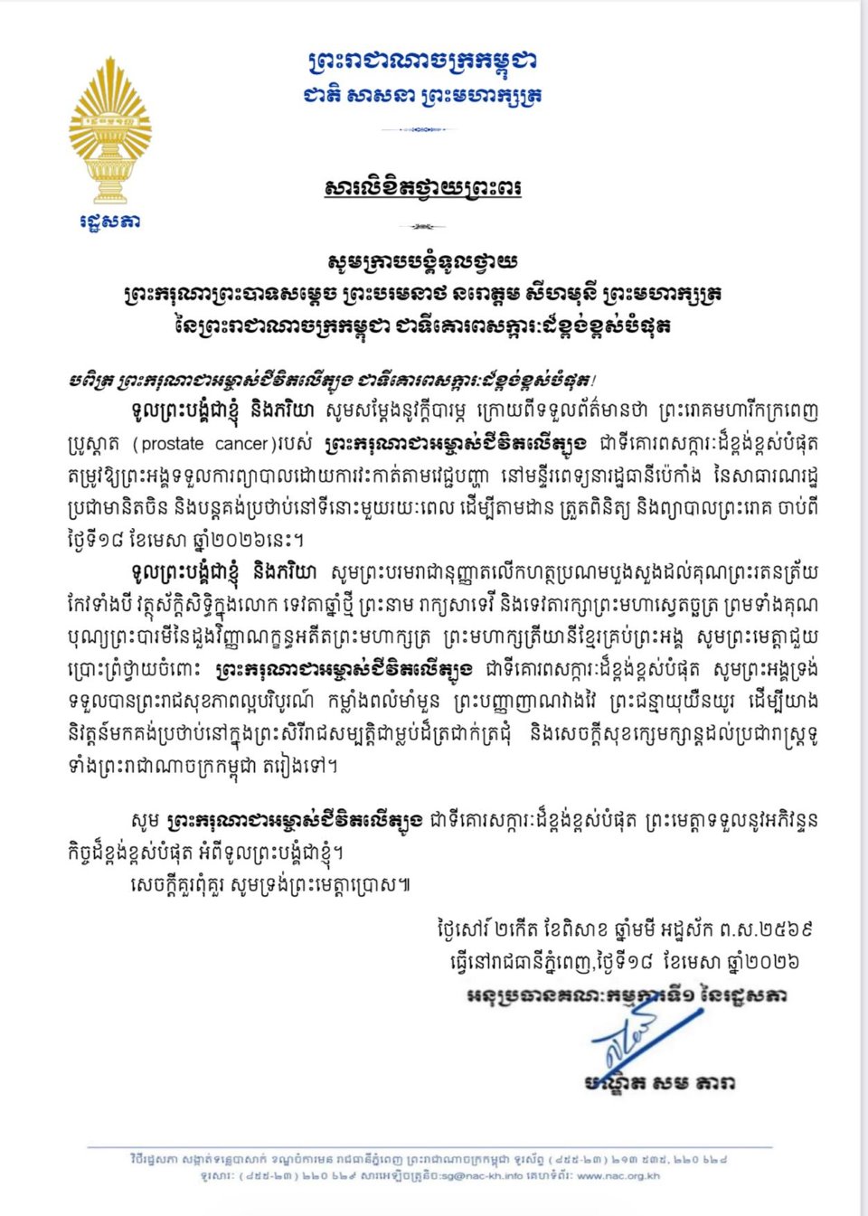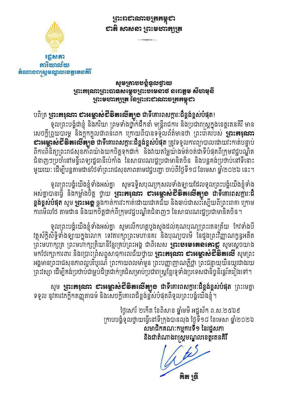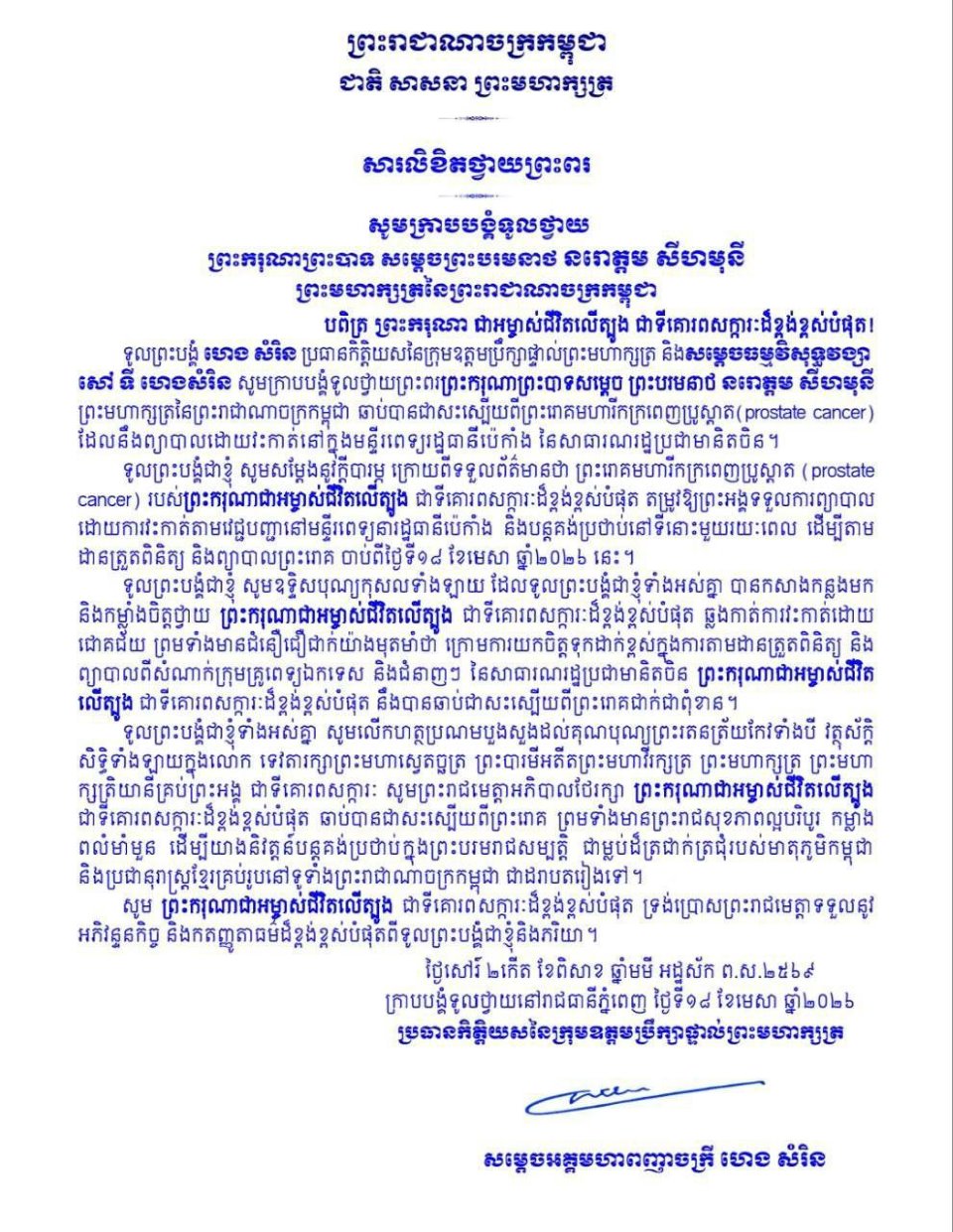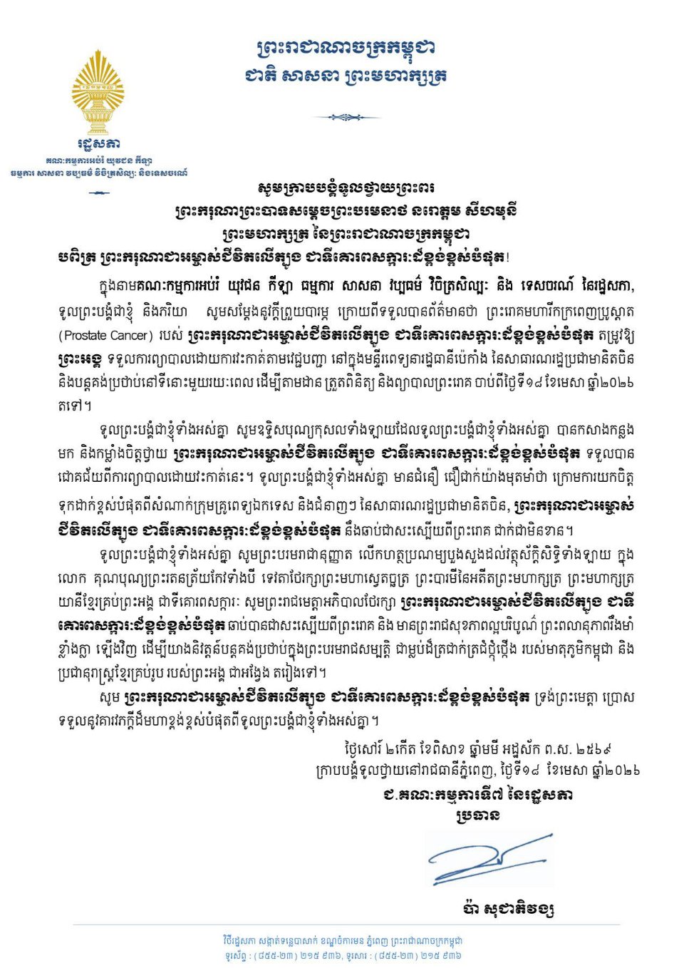 សារលិខិតថ្វាយព្រះពររបស់ សម្តេចមហារដ្ឋសភាធិការធិបតី ឃួន សុដារី ប្រធានរដ្ឋសភា ព្រមទាំង សមាជិក សមាជិការដ្ឋសភា ថ្វាយចំពោះ ព្រះករុណា ព្រះបាទ សម្តេចព្រះបរមនាថ នរោត្តម សីហមុនី ព្រះមហាក្សត្រនៃព្រះរាជាណាចក្រកម្ពុជា
